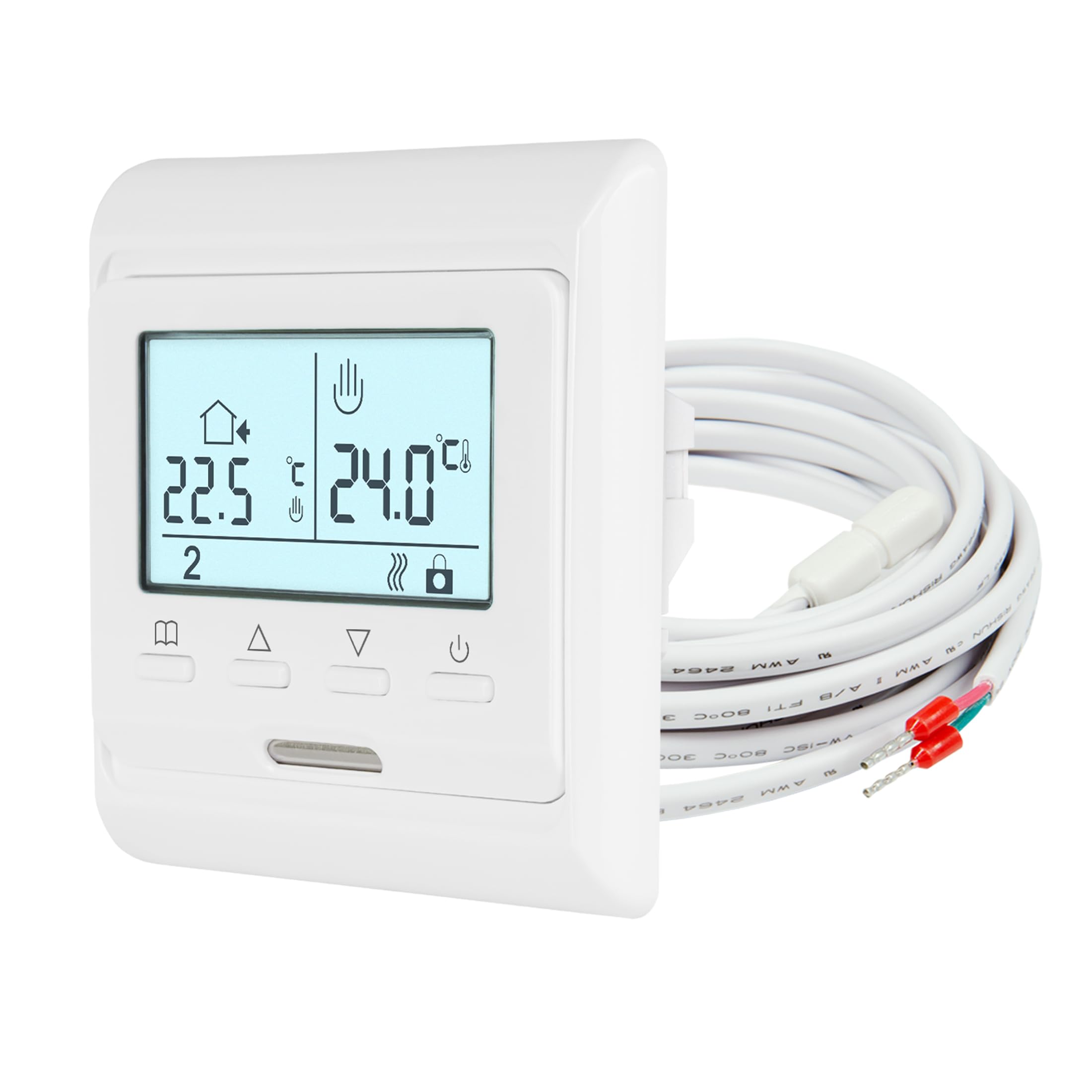 The Mi-Heat E51 thermostat features an intuitive interface with a backlit LCD display and several control buttons.