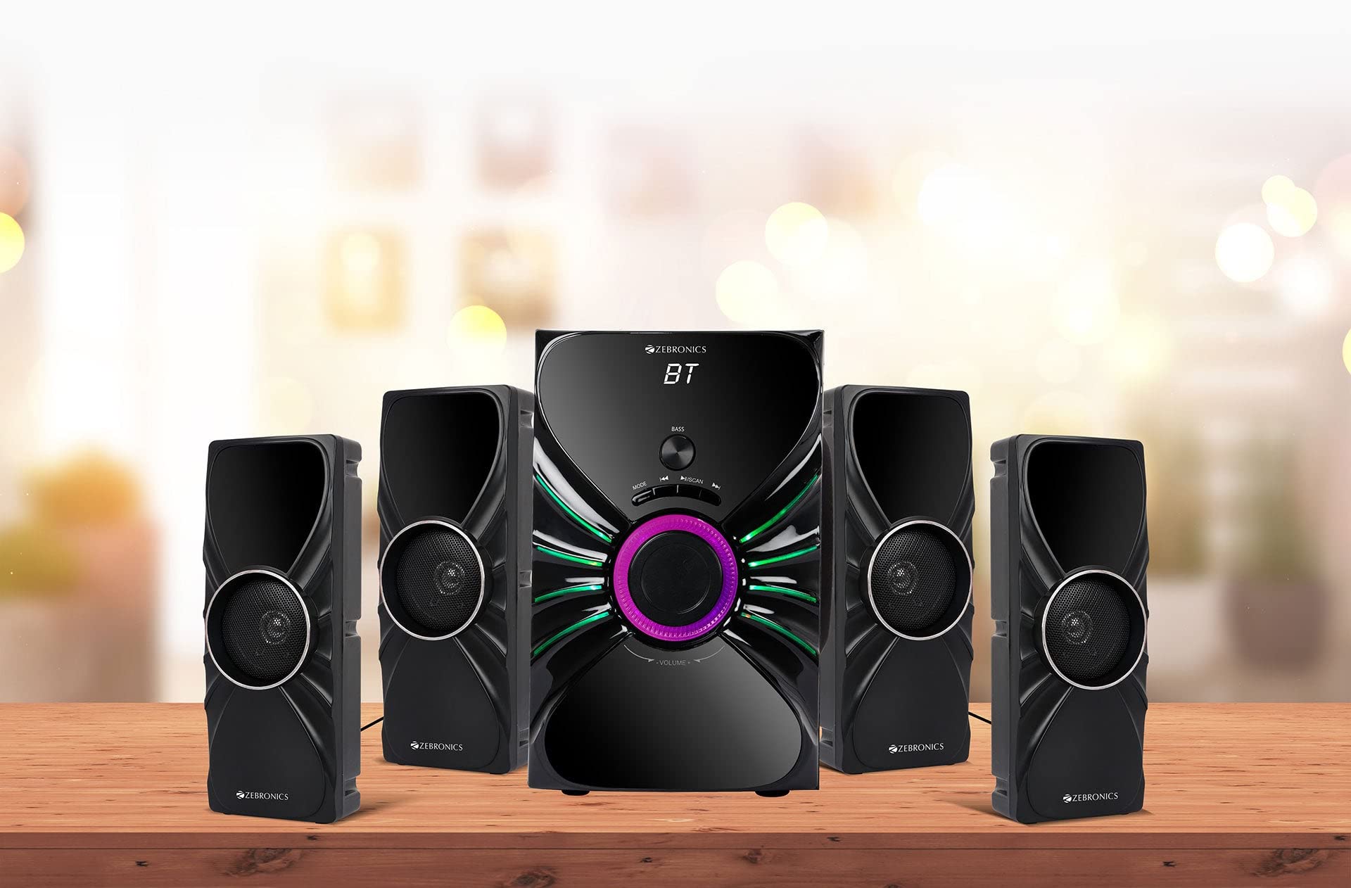 The ZEBRONICS Zeb-Rainbow 400 is a 4.1 channel multimedia speaker system designed for versatile audio playback. It features multiple connectivity options including Bluetooth, AUX, USB, and FM radio. The system includes a powerful subwoofer and four satellite speakers for an immersive audio experience, complemented by integrated RGB lighting.