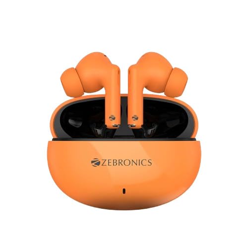 మూర్తి 3.1: The ZEBRONICS Zeb PODS 121 earbuds in their orange charging case. The earbuds are visible, showcasing their in-ear design and the compact nature of the charging case.